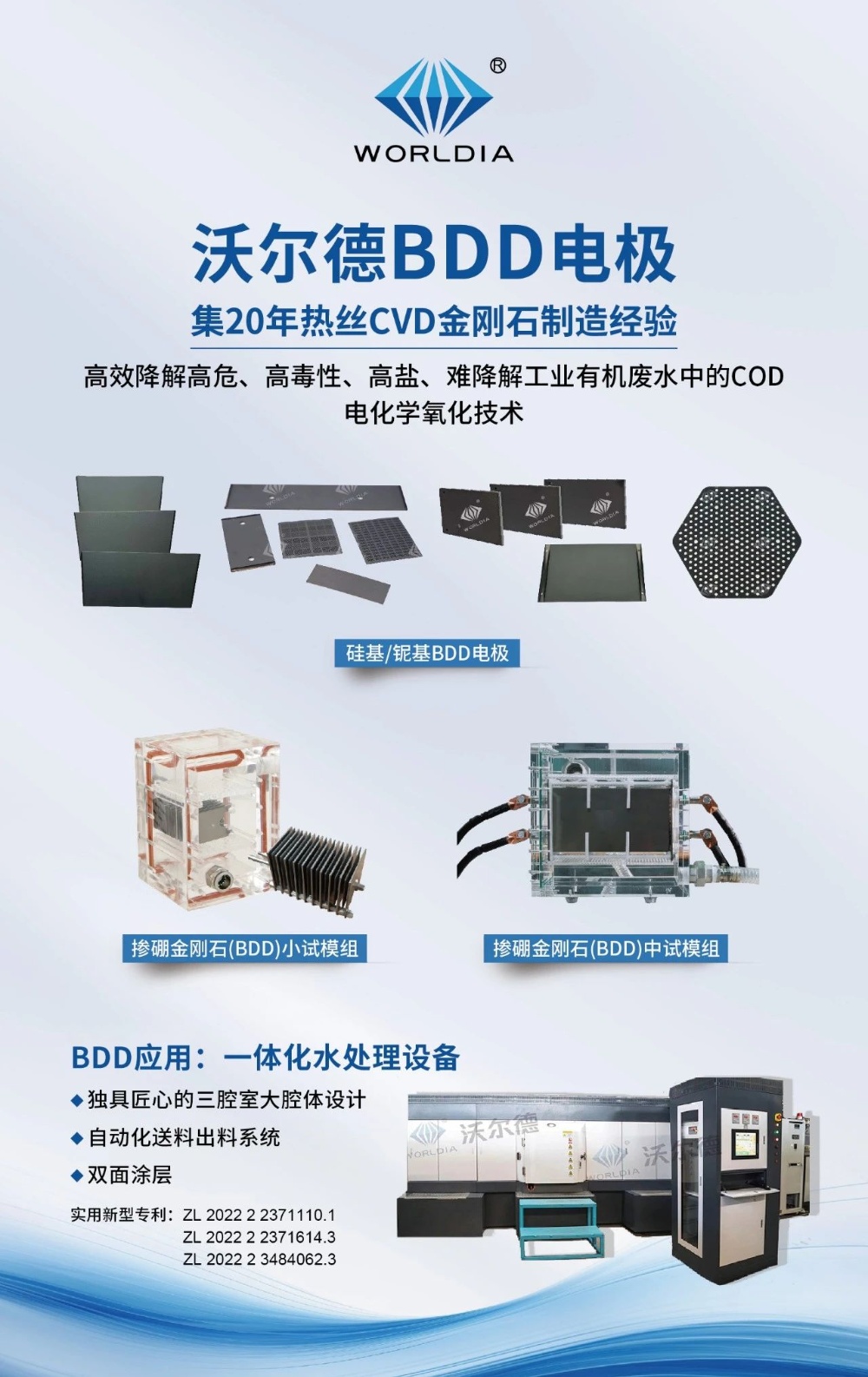 四、沃爾德BDD電化學(xué)氧化法的應(yīng)用BDD電催化氧化法是通過(guò)施加一定的電勢(shì)使BDD電極上產(chǎn)生極具活性和具有強(qiáng)氧化能力的羥基自由基(·OH)、氧氣和其他具有氧化能力的離子。這些離子通過(guò)一系列氧化還原反應(yīng)將有機(jī)物氧化為無(wú)害的物質(zhì),從而達(dá)到水處理的目的。同時(shí),BDD電極表面的高導(dǎo)電性使得電子的輸運(yùn)速度加快,有助于提高電化學(xué)反應(yīng)的速率和效率。