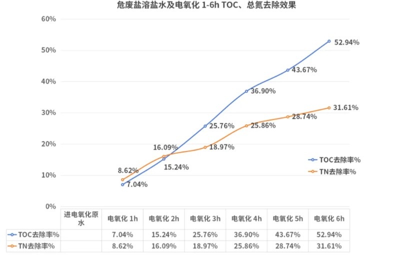 針對(duì)高鹽廢水中復(fù)雜的污染物成分,傳統(tǒng)的處理方法往往面臨效率低、成本高的挑戰(zhàn)。中化環(huán)境采用沃爾德鈮基BDD電極對(duì)高鹽廢水進(jìn)行小試實(shí)驗(yàn)。進(jìn)行6小時(shí)電氧化處理后,實(shí)驗(yàn)結(jié)果顯示,危廢鹽TOC去除率達(dá)到52.94%,總氮去除率也達(dá)到了31.61%。
