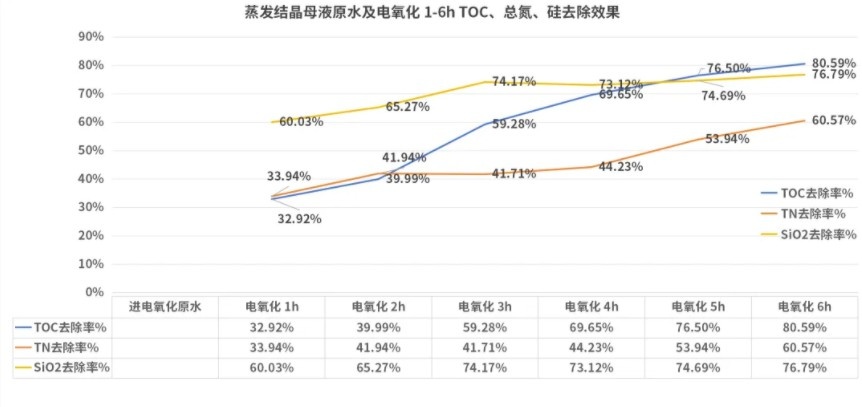 廢鹽蒸發(fā)結(jié)晶母液作為化工生產(chǎn)過程中產(chǎn)生的另一種高鹽高濃度廢水,其處理難度同樣不容忽視。在相同條件下,利用沃爾德BDD電極對(duì)廢鹽蒸發(fā)結(jié)晶母液進(jìn)行6小時(shí)電氧化處理,TOC去除率升至80.59%,總氮去除率達(dá)到60.57%,硅去除率也高達(dá)76.79%。