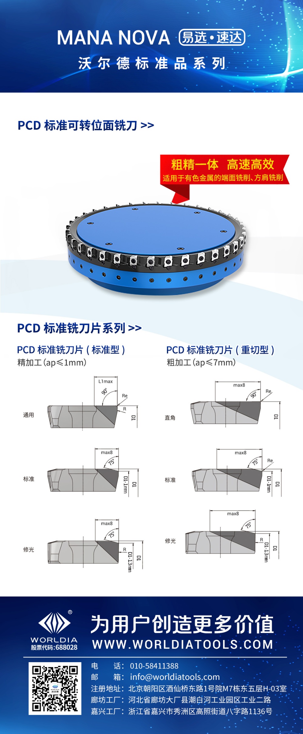 易選、速達(dá),沃爾德MANANOVA標(biāo)準(zhǔn)品,其新增的銑削系列--沃爾德PCD可轉(zhuǎn)位面銑刀,主要用于有色金屬的端面銑削、方肩銑削。