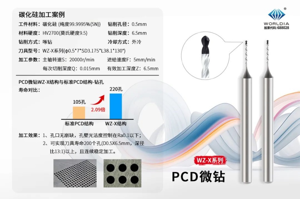 為打破這一壟斷格局,實現(xiàn)同類產(chǎn)品的高端刀具國產(chǎn)化,沃爾德推出全新WZ-X系列PCD微鉆產(chǎn)品。刀具采用特殊結(jié)構(gòu)設(shè)計,對比通用標準的PCD結(jié)構(gòu),可為客戶帶來更加高效、穩(wěn)定、可靠的微孔加工效果。