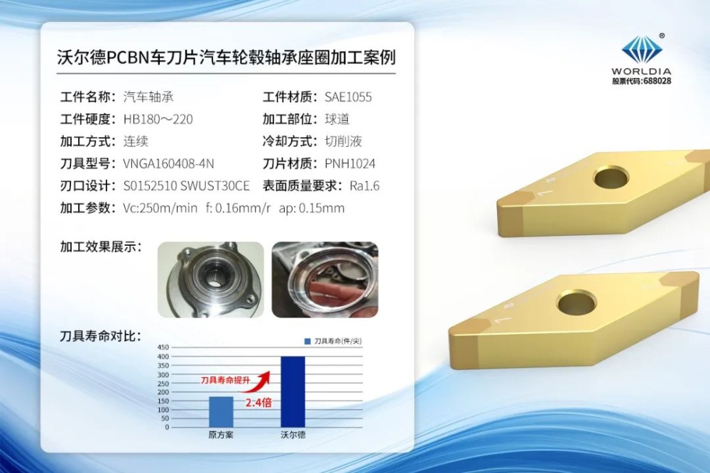 在汽車(chē)制造過(guò)程中,輪轂軸承座圈的加工是一個(gè)關(guān)鍵的環(huán)節(jié)。由于軸承座圈的材料通常選用淬硬鋼,其硬度高、耐磨性好的特點(diǎn)使得加工過(guò)程變得異常復(fù)雜和艱難。傳統(tǒng)的刀具在加工過(guò)程中往往容易出現(xiàn)磨損快、壽命短等問(wèn)題,嚴(yán)重影響了加工效率和質(zhì)量。然而,在使用沃爾德新型PCBN車(chē)刀片進(jìn)行加工時(shí),這些問(wèn)題得到了有效解決。