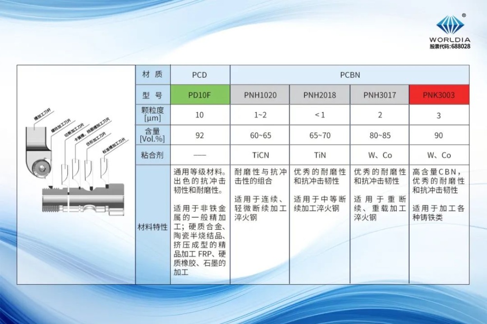 1. 定位加緊可靠,區(qū)別于常用的彈性加緊方式,沃爾德采用特殊設(shè)計(jì)的螺釘和定位槽雙重加緊方式,刀片定位和夾緊更可靠;2. 應(yīng)用靈活廣泛,一把刀桿既能裝夾外圓切槽加工刀片又能裝夾切斷、外螺紋加工、仿形加工等刀片,一種刀片基體只需改變?nèi)锌谠O(shè)計(jì),即可應(yīng)用于外圓槽也可用于端面槽或者內(nèi)孔槽加工,還支持按照客戶不同需求的定制刀具;3. 常用型號標(biāo)準(zhǔn)化,根據(jù)客戶加工過程中一些常用產(chǎn)品,例如標(biāo)準(zhǔn)尺寸的環(huán)簧槽,卡圈槽以及常用規(guī)格的外螺紋,切槽及切斷等產(chǎn)品,沃爾德公司提供標(biāo)準(zhǔn)規(guī)格及常備庫存,方便客戶選擇和實(shí)現(xiàn)及時交貨;4. 槽刀片超硬材質(zhì)多樣化,根據(jù)加工有色金屬、淬硬剛及鑄鐵,沃爾德公司根據(jù)常用不同材料的加工特性提供多種PCD/PCBN超硬材質(zhì)供客戶選擇。