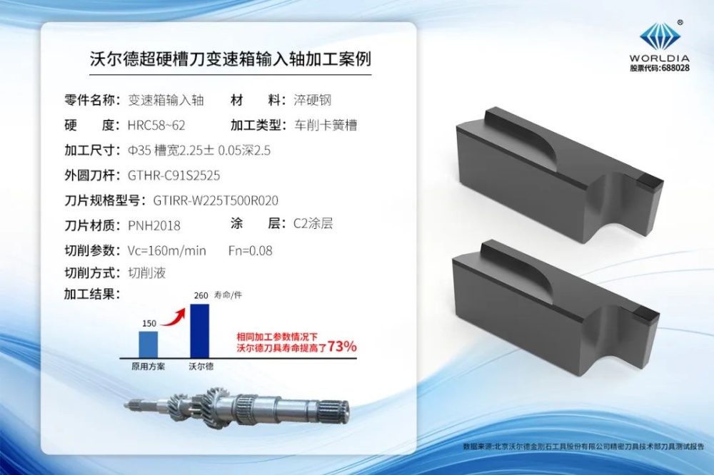 案例分析:在某一加工案例中,客戶原方案采用進(jìn)口PCBN非涂層槽刀片,后轉(zhuǎn)而選用沃爾德C2涂層PNH2018 PCBN材質(zhì)刀片。PNH2018材質(zhì)憑借其卓越的刃口抗崩性,在輕至中斷續(xù)淬硬鋼加工中表現(xiàn)優(yōu)異。加之C2涂層的加持,進(jìn)一步提升了刀片的耐磨性與耐熱性。同時,沃爾德切槽刀桿螺釘與定位槽雙夾緊及定位方式,為該加工方案提供了三重可靠保證。最終,這一解決方案不僅大幅為客戶提高了刀具壽命,還有效減少了停機(jī)換刀時間,提高了機(jī)床的利用率,為客戶節(jié)省了寶貴的時間成本。