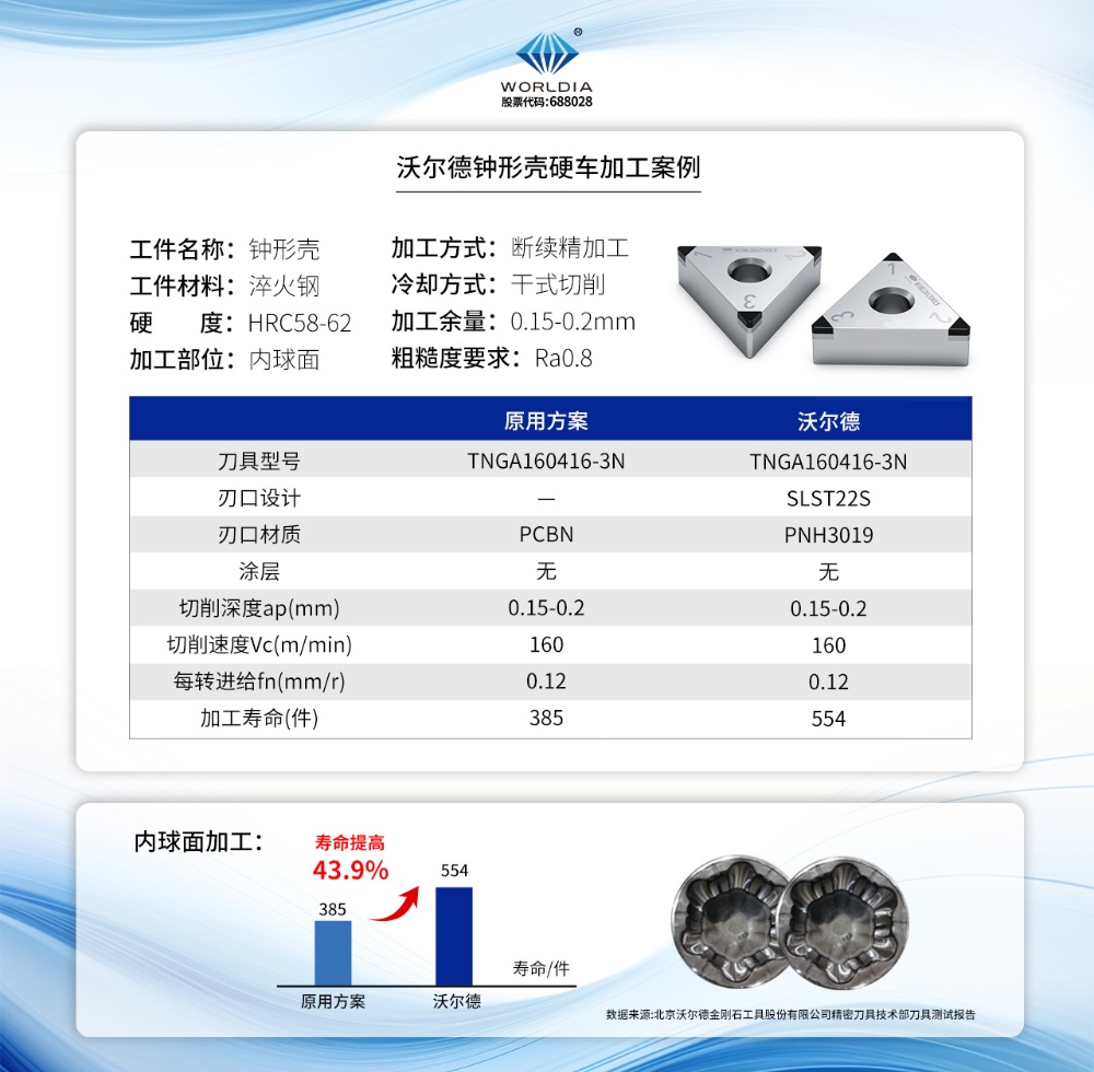 CV-Joint(等速萬向節(jié)),作為球籠轉(zhuǎn)向機(jī)構(gòu)的核心組件,專長于連接并同步旋轉(zhuǎn)不重合的軸,確保動(dòng)力等速傳遞。其獨(dú)特設(shè)計(jì)解決了軸間夾角下的等速動(dòng)力傳輸難題,尤其適用于前輪需同時(shí)驅(qū)動(dòng)與轉(zhuǎn)向的場景,提供穩(wěn)定的大角度偏轉(zhuǎn)能力。相較于傳統(tǒng)十字軸萬向節(jié),CV-Joint有效克服了不等速性問題,是轉(zhuǎn)向驅(qū)動(dòng)橋的理想選擇。鐘形殼是CV-Joint的主要組成零件,本案例通過使用沃爾德PCBN車刀片加工鐘形殼,有效提升加工壽命。