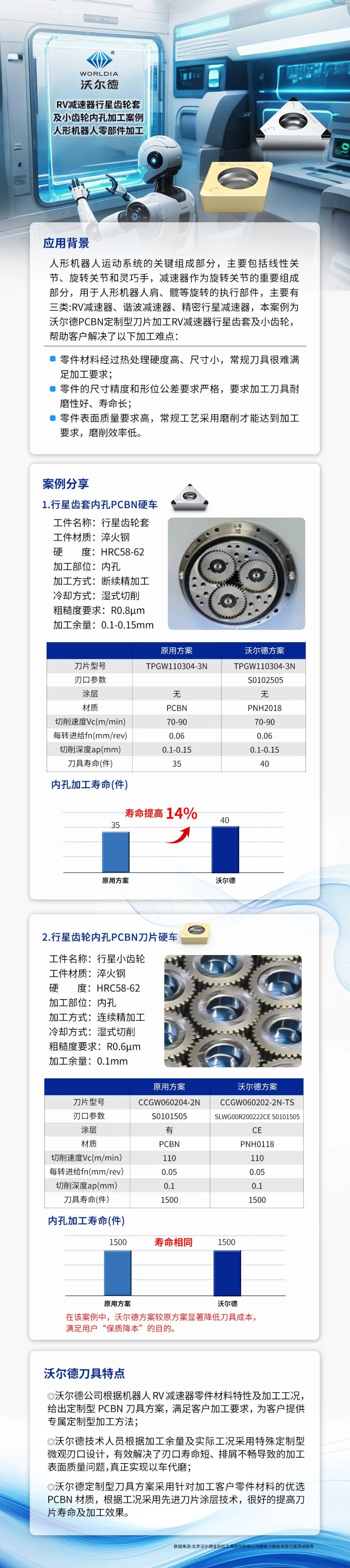 人形機(jī)器人零部件加工 | 沃爾德RV減速器行星齒輪套及小齒輪內(nèi)孔加工案例 2025-07-22 08:37:50 北京沃爾德金剛石工具股份有限公司 瀏覽次數(shù) 1095 上一條汽車輪轂軸承加工 | 沃爾德定制型PCBN車削案例 下一條沃爾德定制型PCBN刀具解決方案-雙金屬發(fā)動機(jī)缸孔鏜削